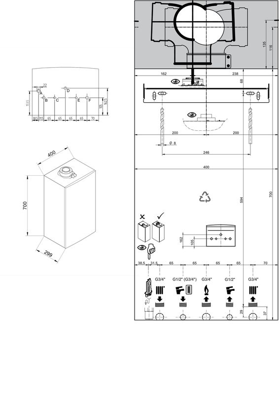 Fűtési előremenő/visszatérő csatlakozás: 3/4"