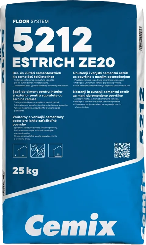 A ZE20 cementesztich kis terhelésű felületekhez alkalmas,önálló aljzatok készítésére úsztatott esztrichként, vagy az alapfelülettel közvetlenül érintkező (kontakt) esztrichként. Alkalmazható kül- és beltérben egyaránt, padlófűtésnél is. Megfelelő burkolattal ellátva nagyobb mechanikai igénybevételnek kitett helyeken is alkalmazható, pl.