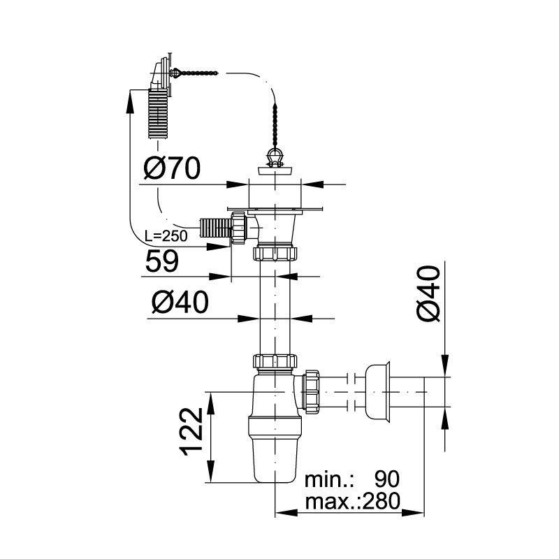 Egymedencés mosogatószifon, túlfolyóval, mosogatógép csatlakozóval,