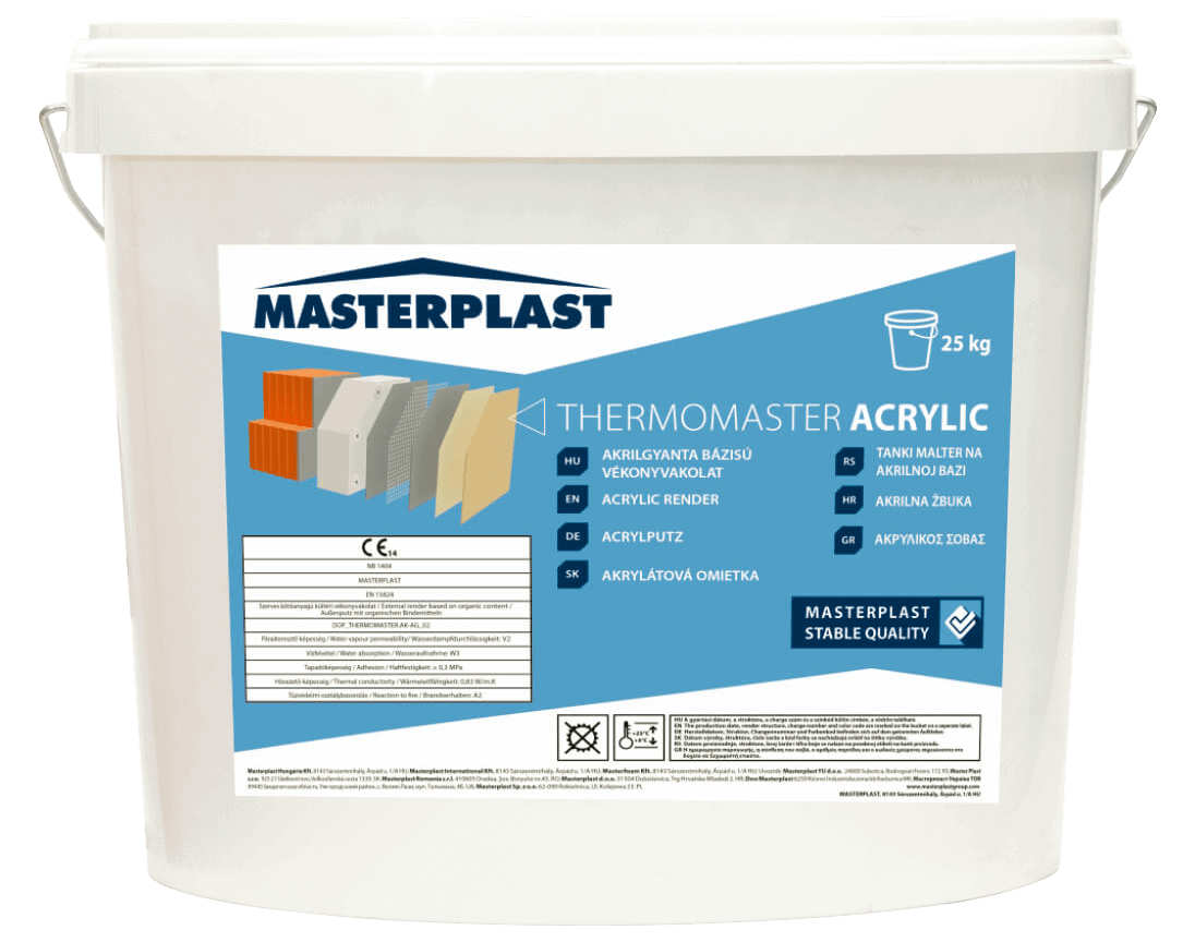 Akrilgyanta bázisú (A), kapart hatású (K) vagy gördülőszemcsés (G) vékonyvakolat; 1,5 vagy 2 mm szemcsenagysággal. A bázisvakolatok a THERMOMASTER színkártya 150 féle színében színezhetőek, de az adott árnyalat homlokzati hőszigetelő rendszerekben való alkalmazhatóságát a színkártyán, az adott árnyalathoz tartozó jelölések figyelembevételével kell meghatározni! A felület előkészítéséhez THERMOMASTER univerzális alapozó szükséges.