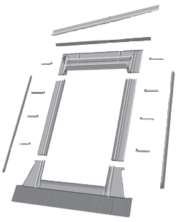 A burkolókeret részei: 1 felső elem hőszigetelő anyaggal. 2 alsó elem hőszigetelő anyaggal és rugalmas aluköpennyel. 3 oldalsó elemek hőszigetelő anyaggal és speciális szigetelő szivacs ékekkel. 4 felső páraelvezető csatorna. 5 rögzítő fémlemez. 6 cserépmegtámasztó profil.
