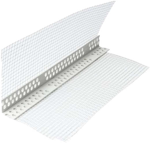 A PVC élvédő üvegszövet hálóval egyesítve a sarkok gyorsabb kialakítását teszi lehetővé, mint a sima élvédő szegéllyel, mivel az üvegszövetet nem kell a sarkon áthajtani.