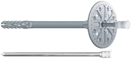 Polipropilén dübel, hőhídmentes fém beütőszeggel EPS, XPS és kőzetgyapot hőszigetelő lapok mechanikus rögzítésére.