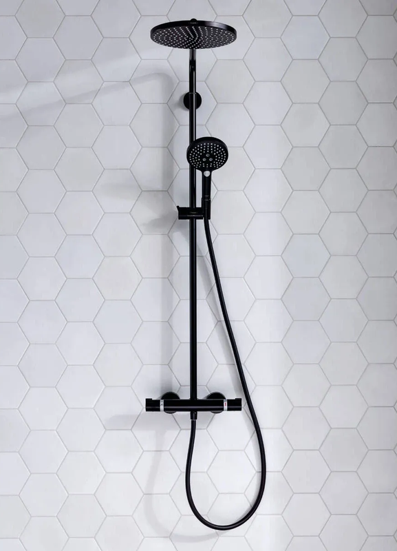 Tartalmazza a következőket: fejzuhany, kézizuhany, termosztátos zuhanycsaptelep, zuhanycső, csúszka