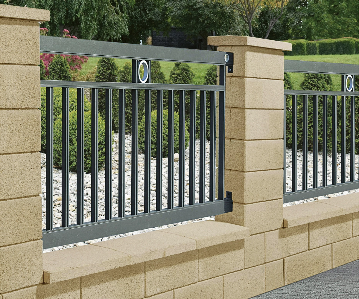 Bézs színű fedlap, klasszikus stílusú, nyersbeton felületű, egyszerűen építhető kerítésrendszer, amely letisztult eleganciájával minden építészeti stílushoz illik, és mindenkit meggyőz.