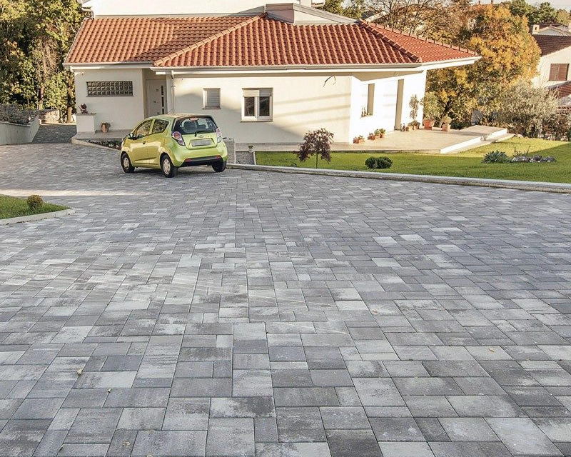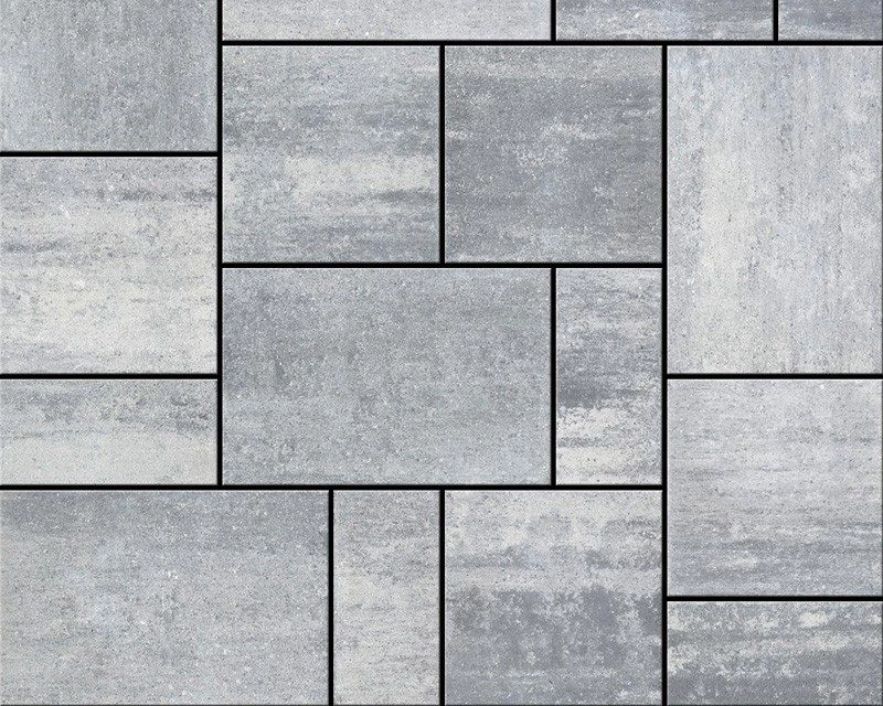 Szürke-fehér színű, modern stílusú, változatos szín- és formavilágú, különleges, melírozott árnyalatban elérhető, kombi térkő, intelligens fugatechnikai rendszerrel, térkő elmozdulás és károsodás nélkül.