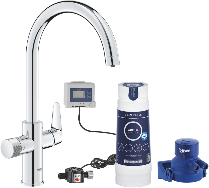 A GROHE Blue Pure BauCurve kezdőkészlet egy okos, nagyszerű megjelenésű konyhai csap,