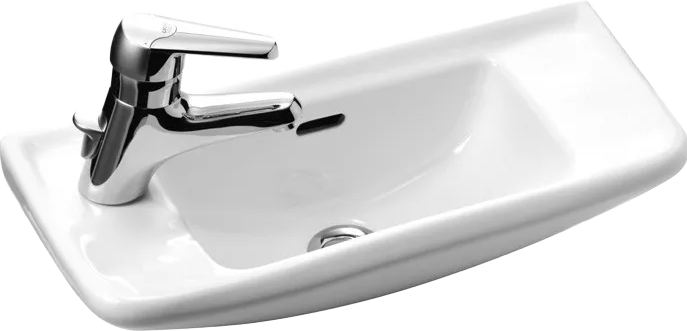 Falra szerelhető kis méretű kézmosó, 1 bal oldali csapfurattal, túlfolyóval.