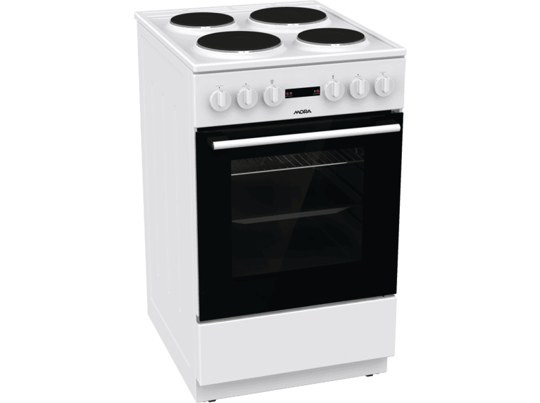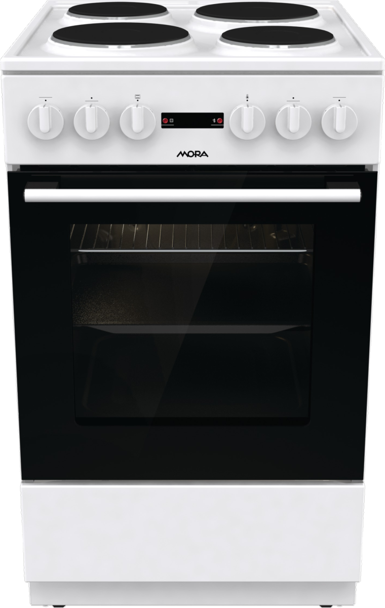 Mora E3241AW vasmagos tűzhely, 50 cm, 4 vasmagos főzőzóna, hőfokszabályzó, grill, sütővilágítás, tető nélkül, fehér, 68 l (3 év garancia fogyasztónak)
