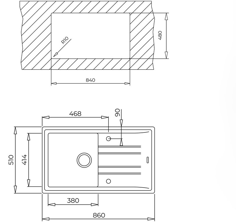 A sorközépen álló mosogatószekrény (modul) szélessége min. 90 cm