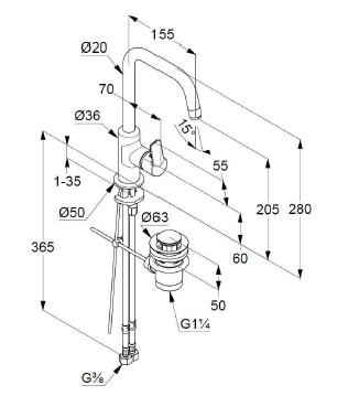 image-1219aeb7.png Alca A390 Click-Clack mosdó leeresztőszelep 5/4", túlfolyóval, fémből, nagy dugóval