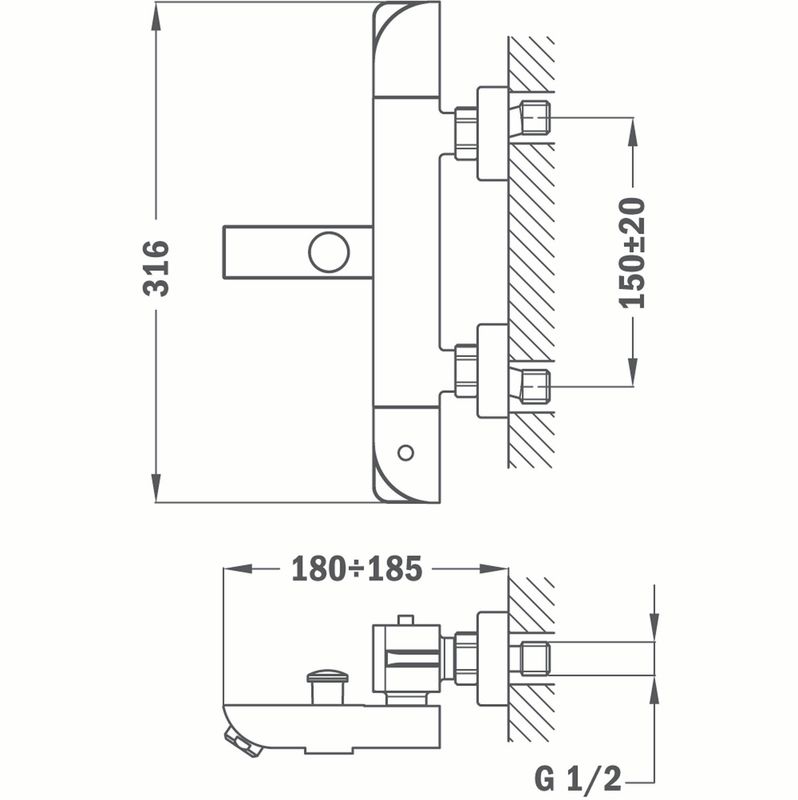 Termosztátos csaptelep kifolyócsővel. Hideg érintés rendszer. Biztonsági hőmérséklet stop 38 °C-on. Szűrővel védett visszaáramlás gátló szelepek. Zuhanyszett nélkül, vízkőmentes perlátor.