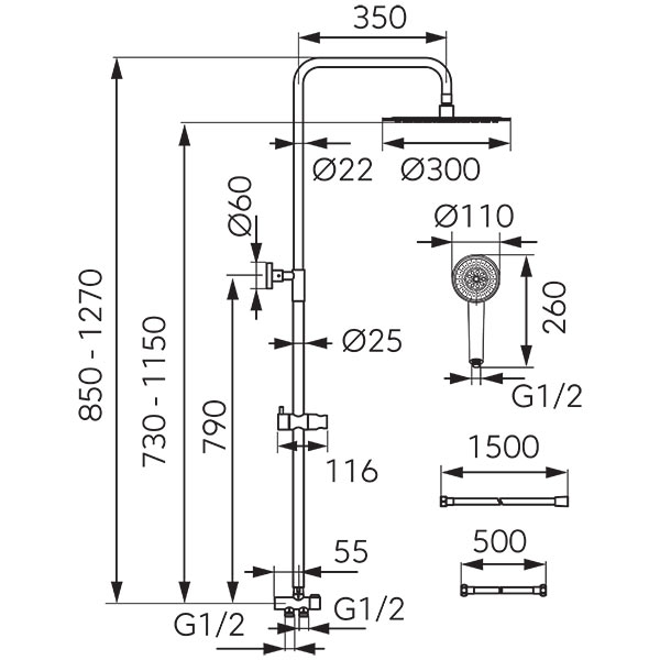a zuhanyrúd magassága 85- 127 cm között állítható