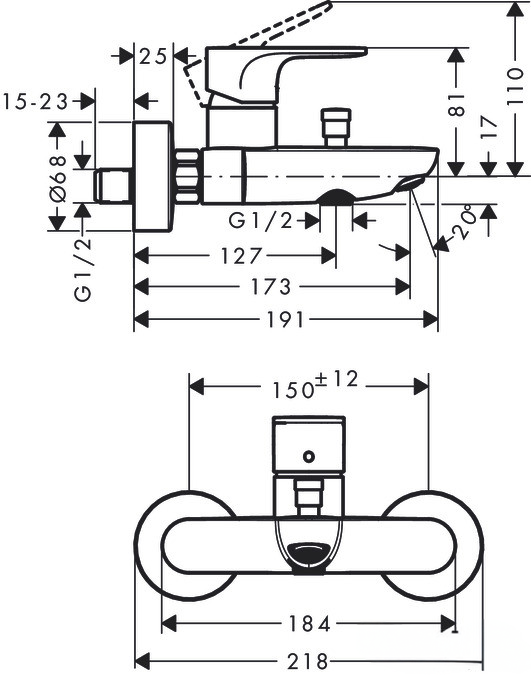 Hansgrohe Rebris S fali, egykaros kádtöltő- és zuhany csaptelep, zuhanyszett nélkül króm