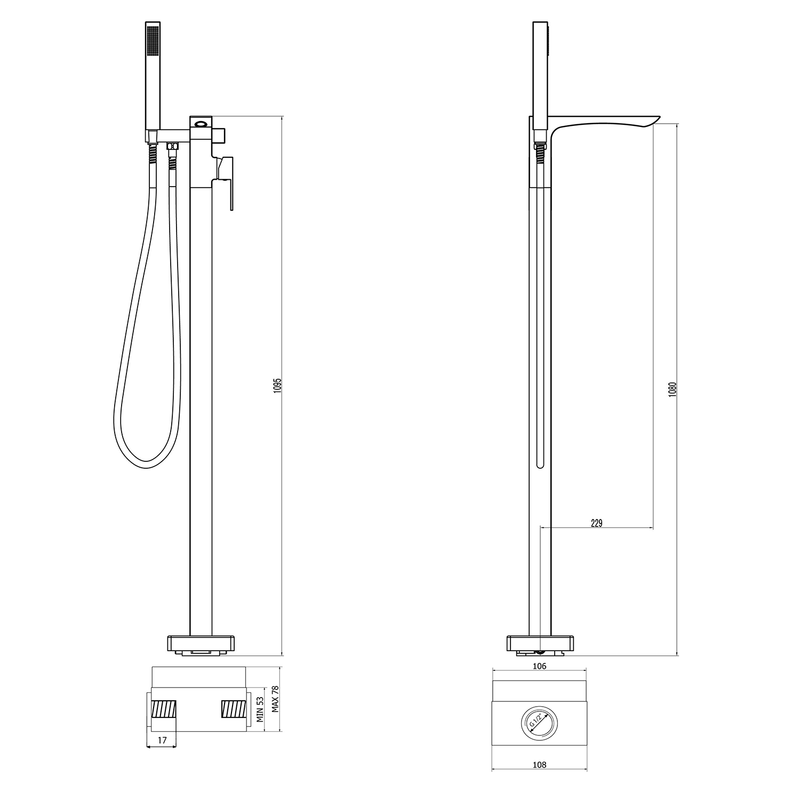 A csomag tartalmaz kézi zuhanyzót, tömlőt és padlóra szerelhető testet.