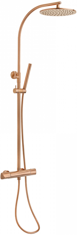 PVD bevonatú szelíd rózsaarany termosztátos zuhanyoszlop, minimalista kialakítással.
