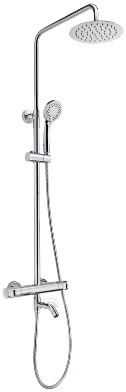 Termosztátos zuhanyoszlop kifolyócsővel, kerek kialakítással.