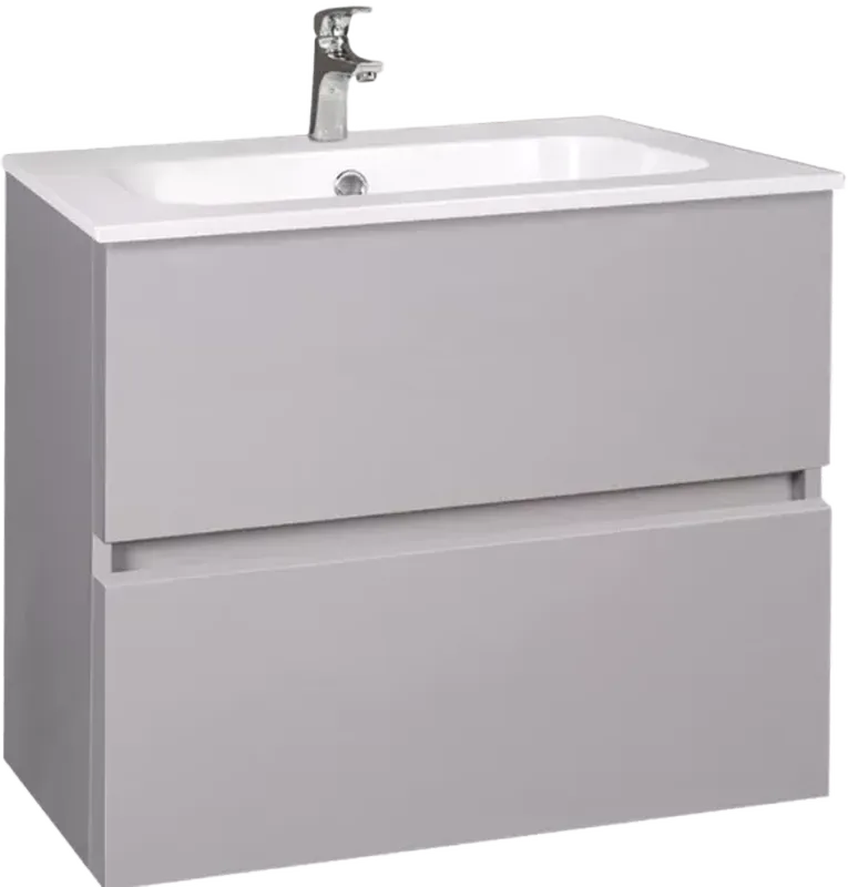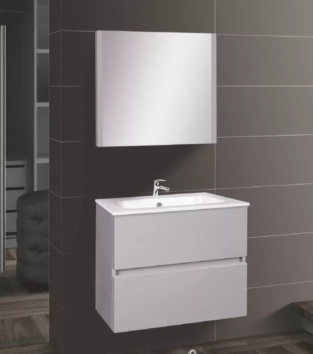 válassza Elois Grey fürdőszobabútort. Tökéletesen illeszthető a fehér mosdótálcához a magasfényű lakozott világosszürke felületű bútor.