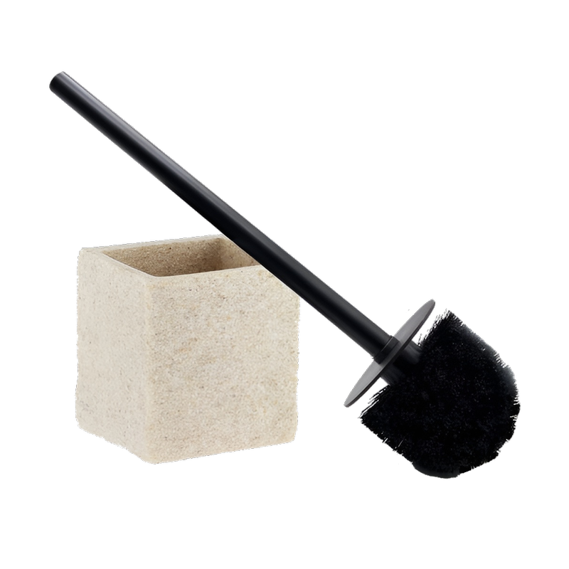 Bézs színű WC-kefetartó fekete színű kefével álló kiszerelés. Esztétikus, kő hatású műanyag.