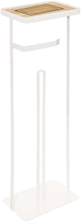 Fehér, szabadon álló toalettpapír-tartó, amely mobiltelefon tárolására is alkalmas. Kombinálja ezt a toalettpapírtartót egy WC-kefetartóval, hogy stílusos megjelenést kölcsönözzön WC-jének vagy fürdőszobájának. A tartó fémből és egy fa telefontáblából készült. A tartóban akár 3 tekercs papír is elfér. Méretek: 18x12x59,2 cm.