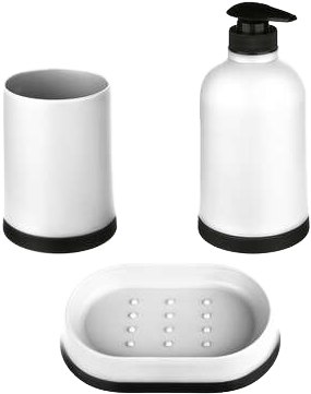 A szett modern dizájnja friss megjelenést kölcsönöz fürdőszobájának, és segít rendszerezni azt. A szett tartalmaz egy folyékony szappan adagolót, egy evőeszköztartót és egy szappantartót. A folyékony szappan adagoló könnyen feltölthető. A termékek nem csúsznak és nem károsítják a felületet. Kiváló minőségű polipropilénből készültek.
