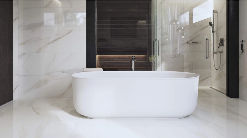 Fehér, fényes, márványhatású,rektifikált fürdőszoba,