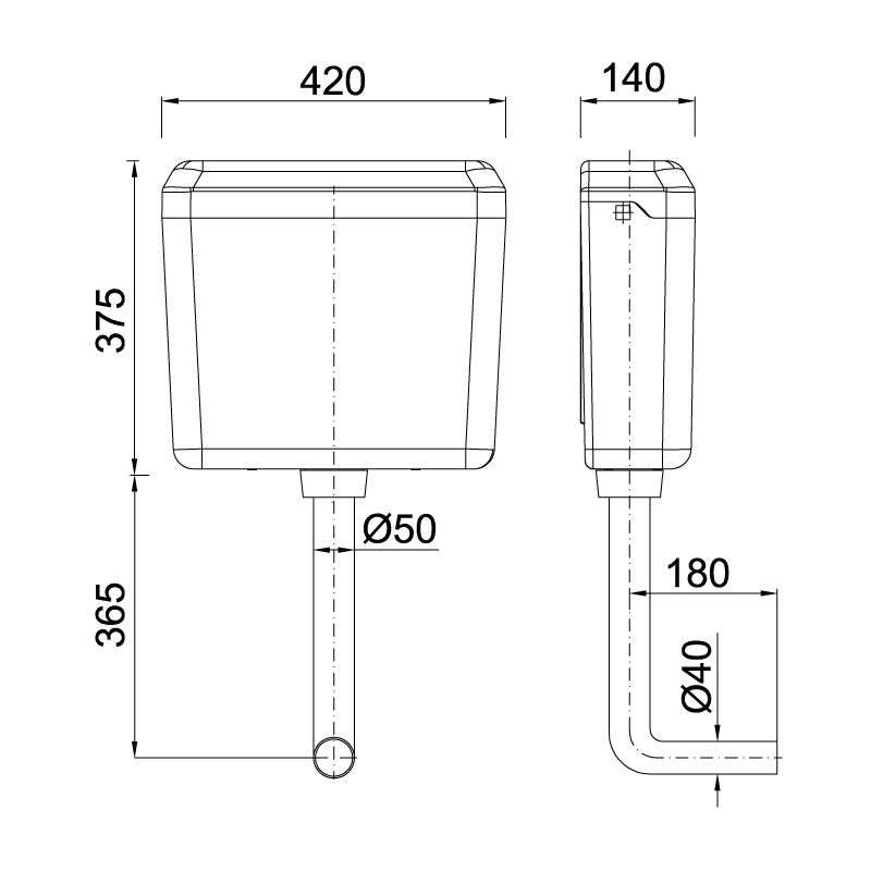 Vízcsatlakozás hátulról, Oldalsó bekötésű, START/STOP gombbal szabályozható vízöblítés, WC-tartály belseje: Zaj és pára védő polisztirol betéttel ellátott, 40/50 mm-es öblítőcsővel, Rögzítő fülek falra rögzítéshez