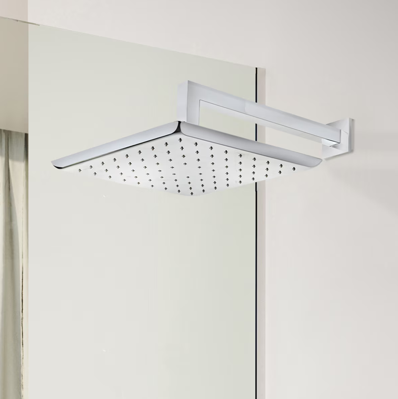 Szögletes, sárgaréz zuhanyfej kifolyócsővel.