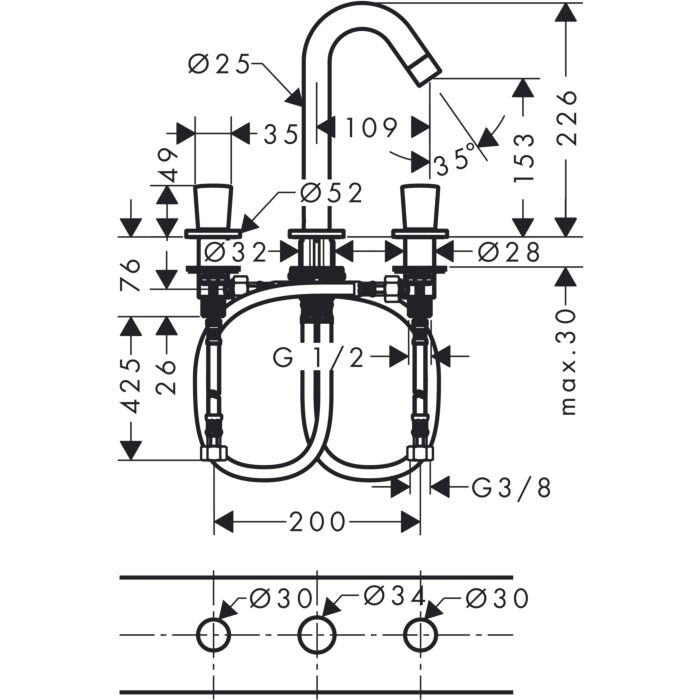 Hansgrohe Logis 3-lyukú mosdóba szerelhető mosdó csaptelep, leeresztővel