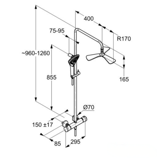 Falra szerelhető kivitel függőlegesen és vízszintesen állítható felszállócső névleges vízmennyiség: (BB osztály) hőfokszabályzó kar 38°C-ra beállított 90°-os elfordítású, kerámia-vezérlőegységgel kézizuhany: szelep hátra fordítva tányér fejzuhany: szelep előre fordítva visszafolyásgátlóval a csúszka pozíciója függőlegesen állítható KLUDI SUPARAFLEX SILVER gégecső 6107205-00 fejzuhannyal: KLUDI FIZZ 6757805-00 KLUDI FIZZ 3S kézizuhannyal (6770005-00) rögzítőkészlettel