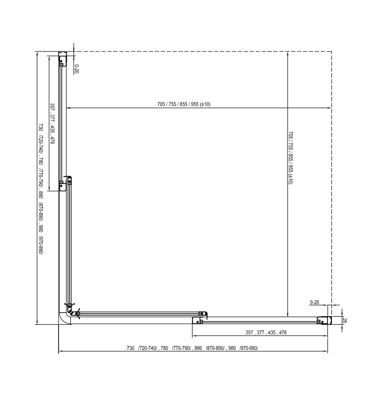 Egy teljes zuhanykabin kialakításához két darab SRV2-S tolóajtó szükséges. Mindkét rész különböző méretének kombinációjával négyzet vagy téglalap alapú zuhanykabint alakíthatunk ki (pl.: 75 x 90 cm, 90 x 90 cm, 80 x 100 cm és így tovább).