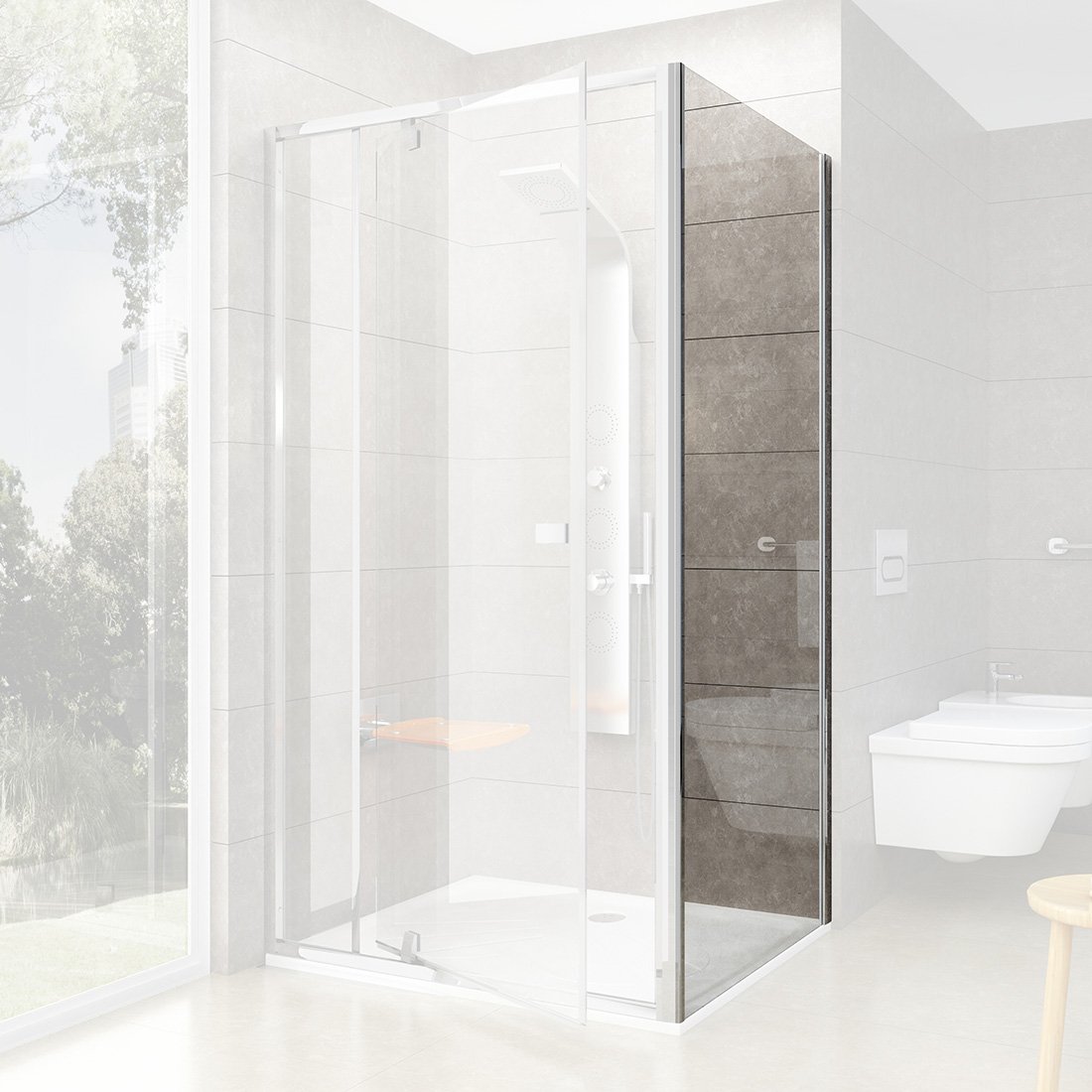 Pivot fix fal krómhatású színben. Átlátszó, edzett biztonsági üvegből készült, RAVAK AntiCalc® vízlepergető réteggel ellátva.
