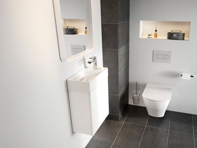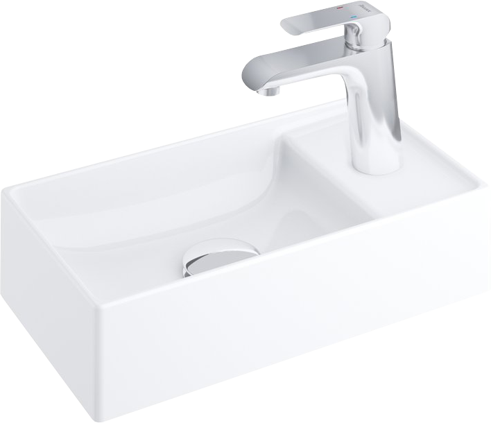 A kézmosó elforgatható, ezért az álló csaptelep felszerelhető jobb- vagy bal oldalon is.