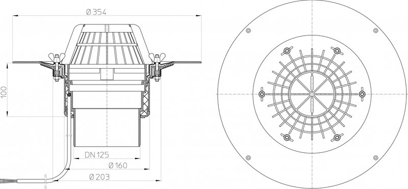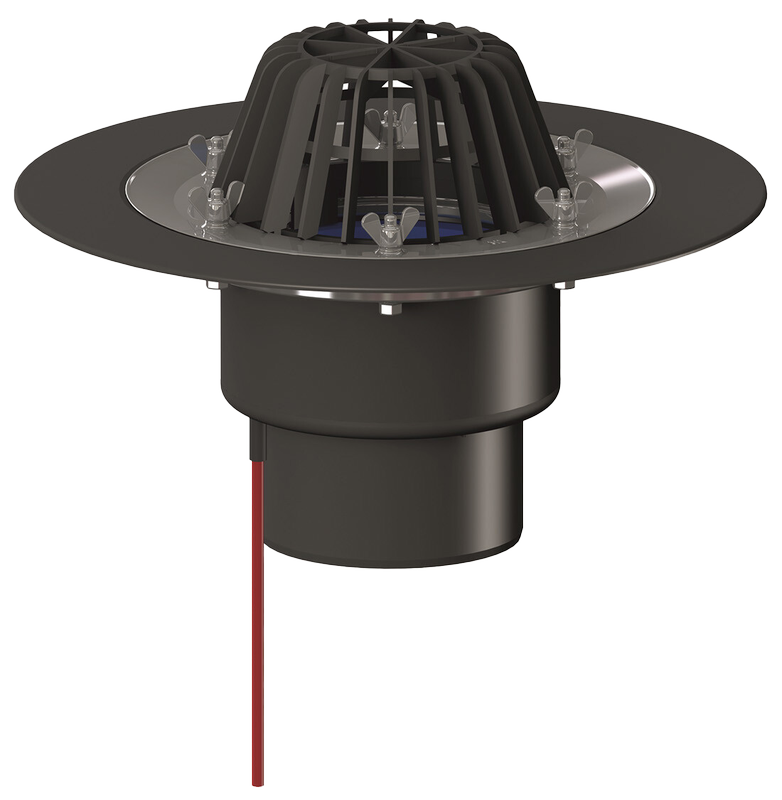 HL62.1/2 Tetőlefolyó DN125 szigetelőkarimával, szorítóelemmel és 10-30W/230V fűtéssel
