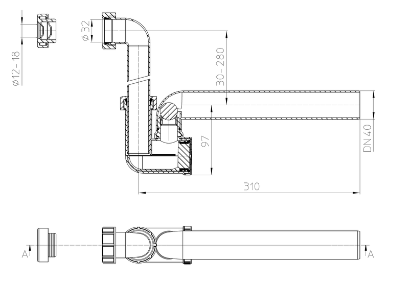 HL136NT kondenzvíz szifon DN40, DN32 vagy D112-18mm vízszintes