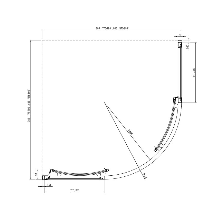 A zuhanykabin a fürdőszoba lecsempézett sarkába RAVAK Ronda, Elipso, Elipso Pro, Elipso Pro Flat, Elipso Pro Chrome zuhanytálcákra vagy közvetlenül a zuhanyfolyókával vagy padlóösszefolyóval rendelkező lecsempézett padlóra telepíthető.