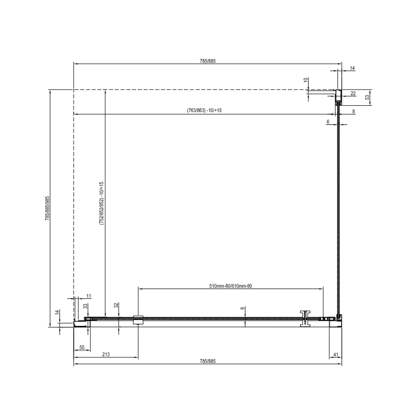 Két NPSS fix fal és egy zuhanyajtó kombinációjával „U” alakú zuhanyzó hozható létre. Az NNPS toldóprofil használatával a termékek 20 mm-rel bővíthetők,