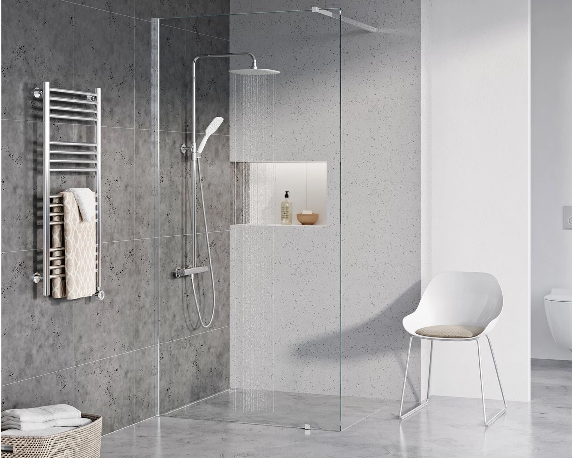 A termék stabilitását egy fém merevítő biztosítja, amely meghatározza a belépés szélességét. A Walk-In Wall zuhanykabin fényes krómozott fém alkatrészekkel rendelkezik. Javasoljuk burkolt fürdőszoba sarokba történő telepítését, közvetlenül a padlóra, beépített padlóösszefolyóval vagy zuhanyfolyókával. A zuhanykabin univerzális, a beszereléskor választható jobb vagy bal oldali belépés. A csomag tartalmaz egy fix üvegfalat beállító profilt, fényes króm kivitelben.