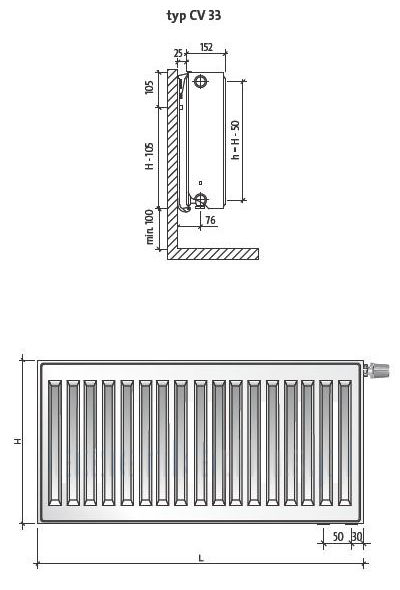 Konvektorlemezzel és beépített termosztatikus szeleppel szerelt lapradiátor, lefedésekkel.