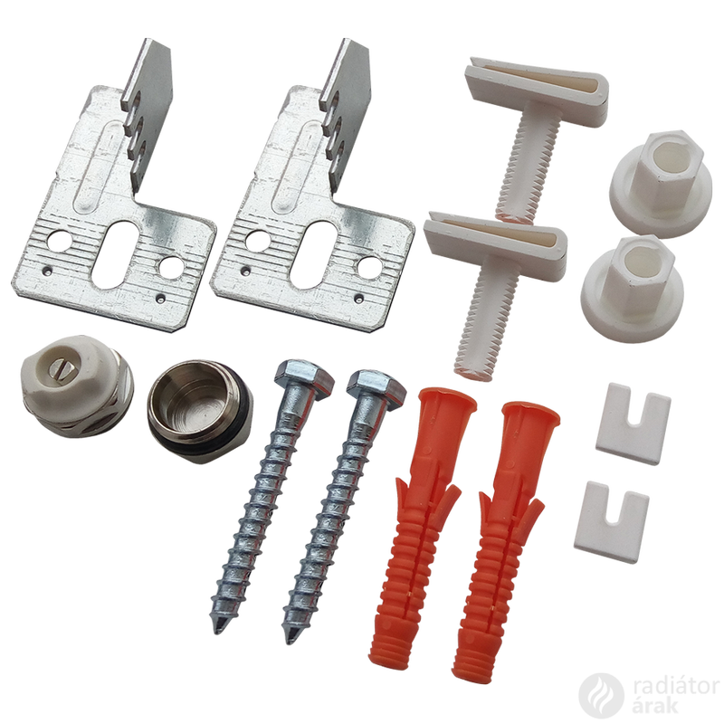 Univerzális szögvas felerősítő szett vakolt és nyers falhoz, ami 3 db állítható, hangvédőbetétes szögvasfülből, 3 db távtartóból, 3 db tipliből és hatlapfejű csavarból, + 1 végdugóból és 1 légtelenítőből áll. Beállítási lehetőségek: a faltól a fűtőtest füléig 10, 30, 43, 53 valamint 63 mm.