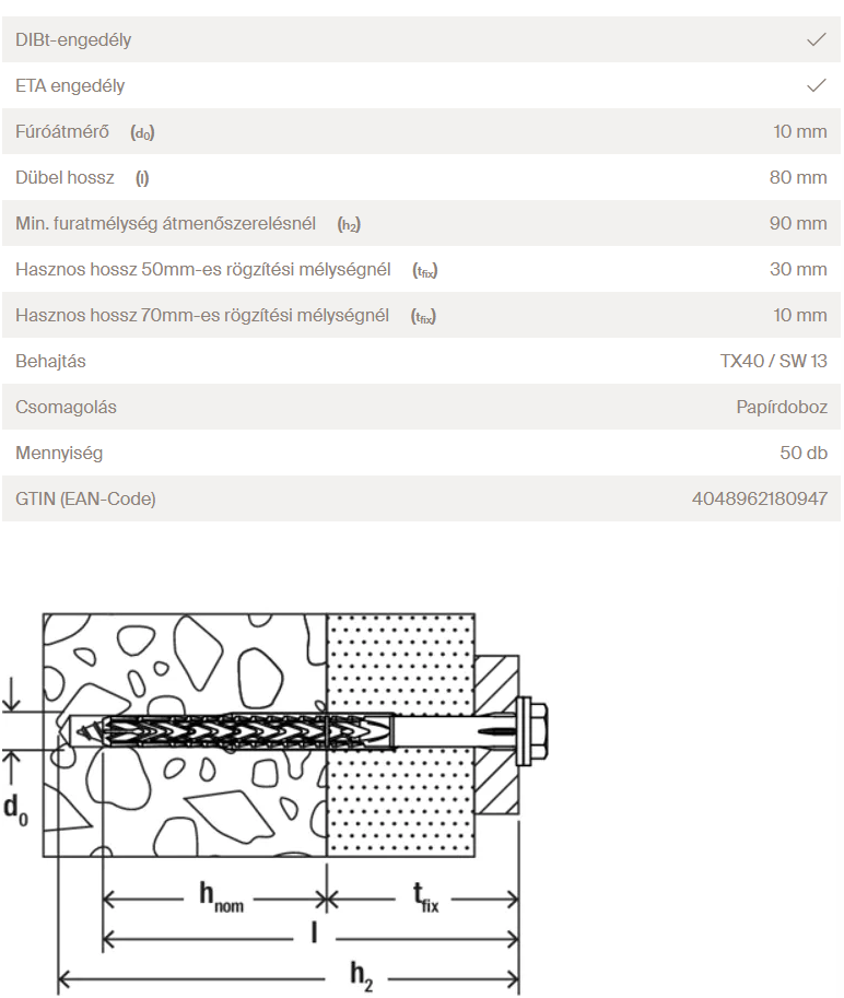 ETA besorolás kiváló terhelési adatokkal: nem szerkezeti rendszerek többpontos rögzítéséhez betonba, falazatba..