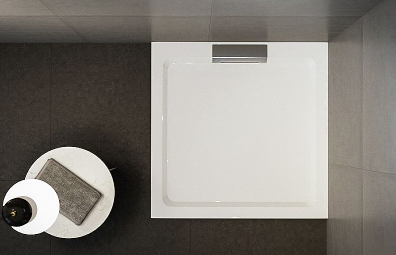 Egyedi leeresztővel ellátott elegáns, letisztult, öntött műmárvány zuhanytálca nagy teherbírással.