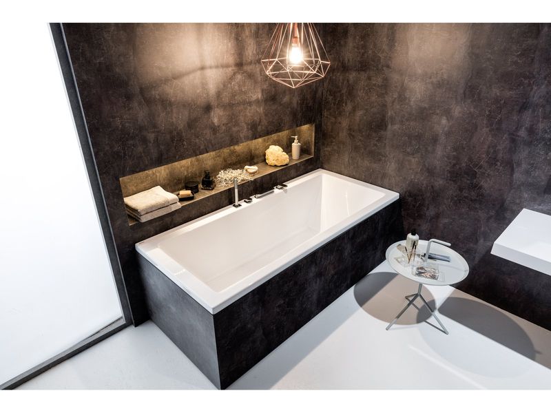 A formatervező szándékosan nem tartotta be a téglalap alakú kádak klasszikus szimmetriáját, ezért az egyik pereme szélesebb a másiknál.