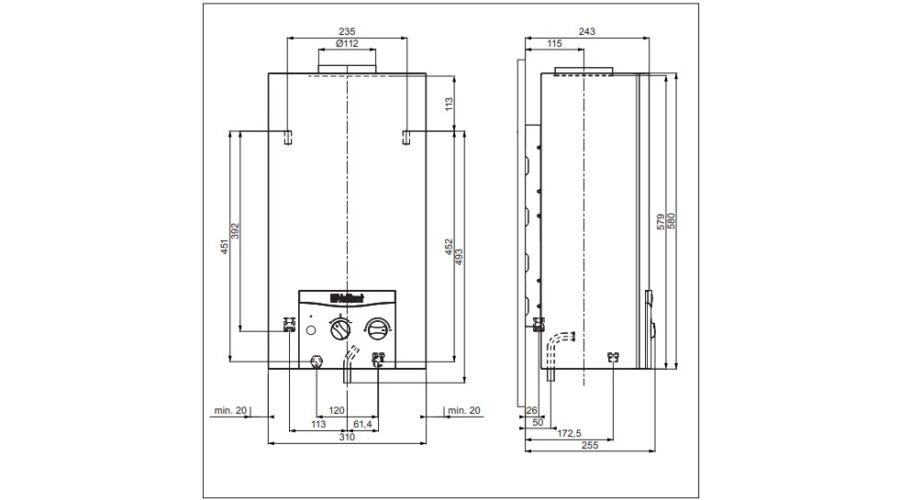 Gázüzemű, átfolyó rendszerű kéményes vízmelegítő.