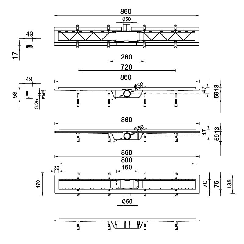 Styron leeresztőszelep, szögletes túlfolyóval, csepptálcás kivitelhez 6/4"