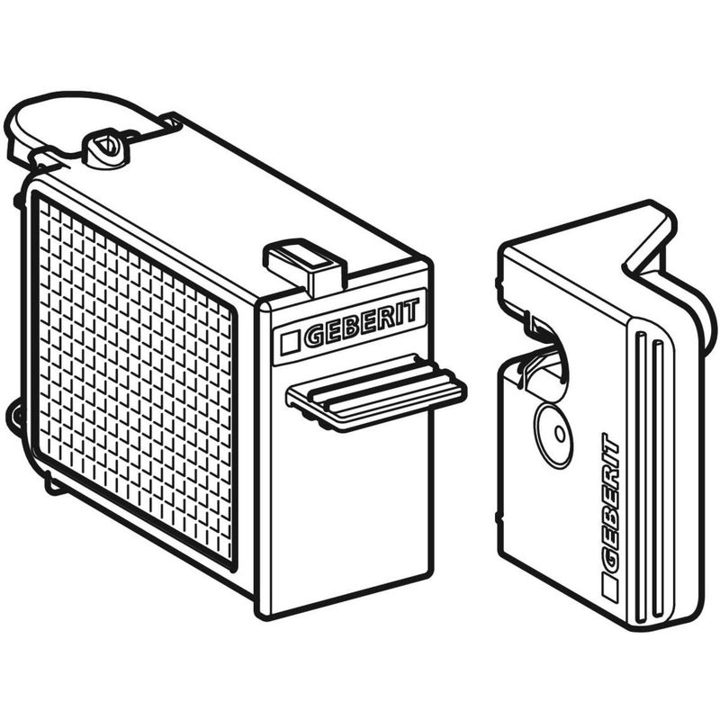 Szállítási terjedelem: Szűrő tartóban és Geberit DuoFresh vízkezelő tabletta behelyezést segítő fülek