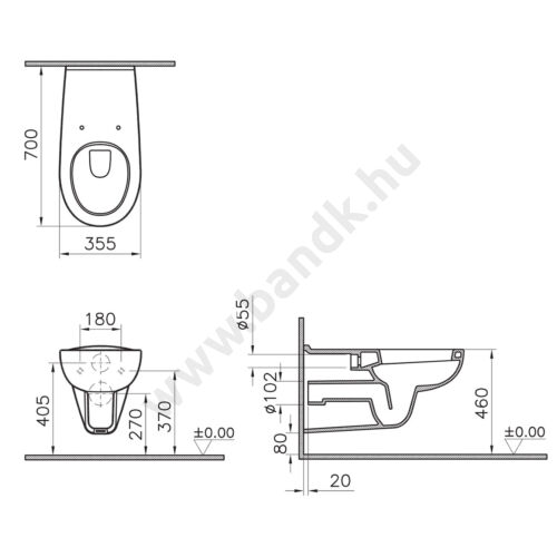 B&K Porcelán WC-kagyló mozgáskorlátozottaknak, fali, hátsó kifolyással 700 mm kinyúlással