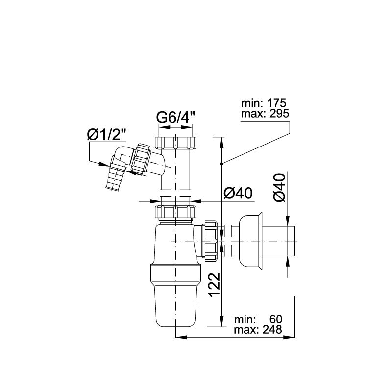 Styron egymedencés mosogatószifon, leeresztőszelep nélkül, mosogatógép csatlakozóval, 40 mm-es elfolyással
