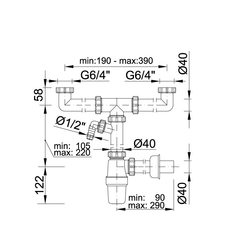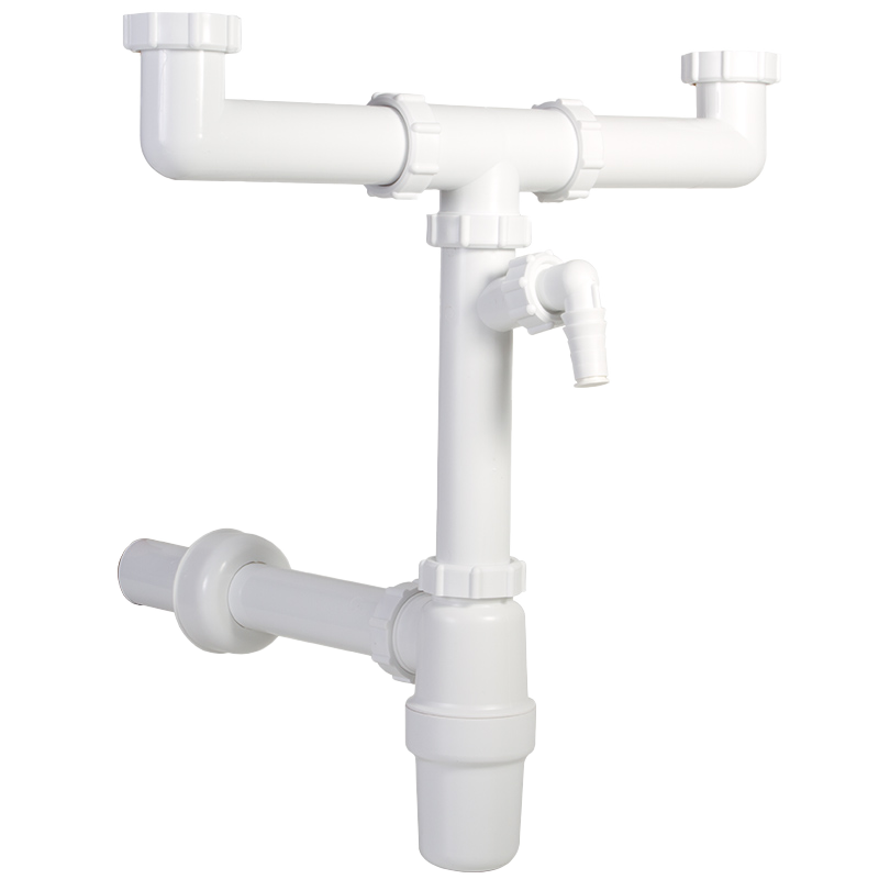 Kétmedencés mosogatószifon, mosógatógép csatlakozós, leeresztő szelep nélkül.