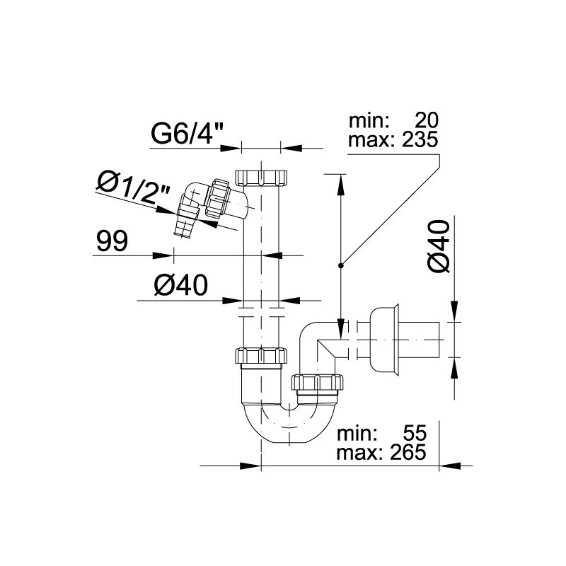 Csőszifon, leeresztőszelep nélkül, mosogatógép csatlakozóval.